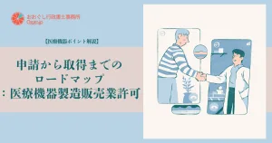 - 【医療機器ポイント解説】申請から取得までのロードマップ:医療機器製造販売業許可医療機器ビジネスの関門「製造販売業許可」の申請ロードマップ。必要な準備、書類、審査の流れ、期間の目安を行政書士が解説します。計画的な事業開始のために、まずこの記事で全体像を掴みましょう。