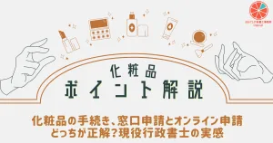 - 化粧品の手続き、窓口申請とオンライン申請どっちが正解?現役行政書士の実感化粧品の申請手続き、窓口とオンラインどちらを選ぶべき?現役行政書士が現場のリアルな実情を解説します。リードタイムの確実性や「紙の控え」の安心感など、それぞれのメリット・デメリットを比較。迷っている担当者様へ最適な選び方を提案します。