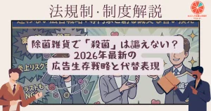 - 除菌雑貨で「殺菌」は謳えない?2026年最新の広告生存戦略と代替表現除菌雑貨で「殺菌」標榜はガッツリ法律違反。2026年のSNS広告で生き残るための「言い換え」テクニックと、インフルエンサーの暴走を「仕組み」で管理するリスク低減策を、行政書士が攻めの視点で伝授します。