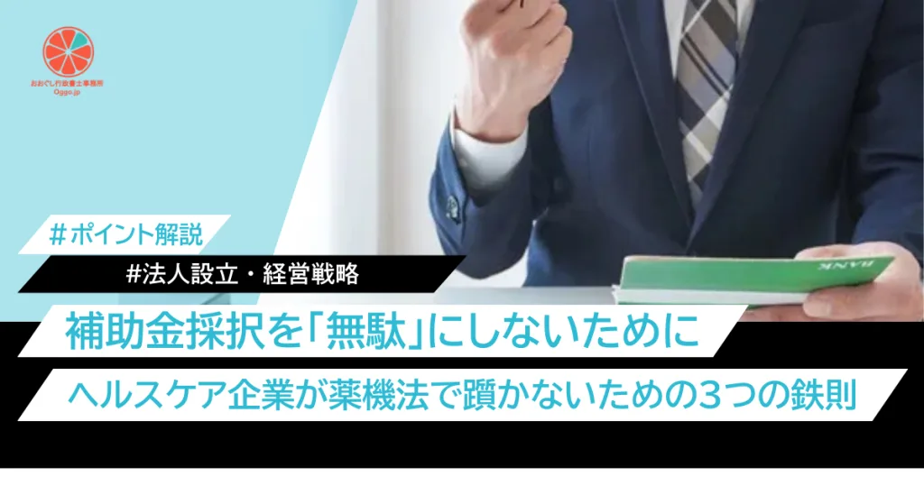 【行政書士の視点:なぜこの記事を今読む必要があるのか】 フェムテック市場は現在、国や自治体による『フェムテック開発支援補助金』などの追い風が吹いています。しかし、安易に飛びつくのは危険。薬機法違反(無許可販売や誇大広告)が発覚すると、受給した補助金の全額返還を命じられるだけでなく、数年間の指名停止処分を受けるという、会社が傾きかねないリスクがあります。