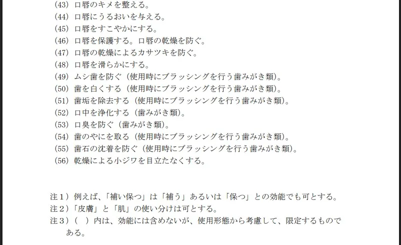 このとき、化粧品の効能の範囲も改定され、平成12年12月28日付け医薬発第1339号(医薬安全局長通知)で、類別に効能を規定する現行の仕組みを廃止し、化粧品に該当する効能全体を規定する仕組み(55項目)に改められました。こちらも一部キャプチャー画像を。55項目あります。